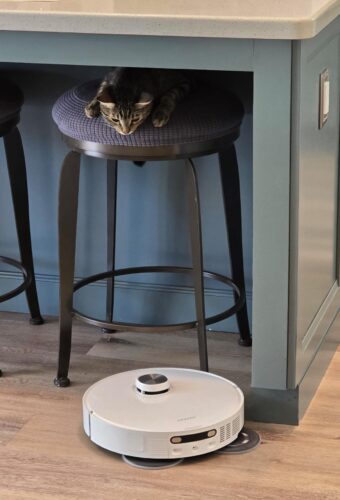 What I like best about this robot is that it gets right up against the baseboards and under cabinets to vacuum and mop. Those are always the hardest areas to keep clean in our kitchen, and it’s neat to watch the robot pop out its spinning side brush and mop pads to scrub those areas. There is also an onboard camera that gives you a bot’s eye view of what the robot sees, which is pretty fun. It’s fairly quiet while running and does a very good job cleaning.