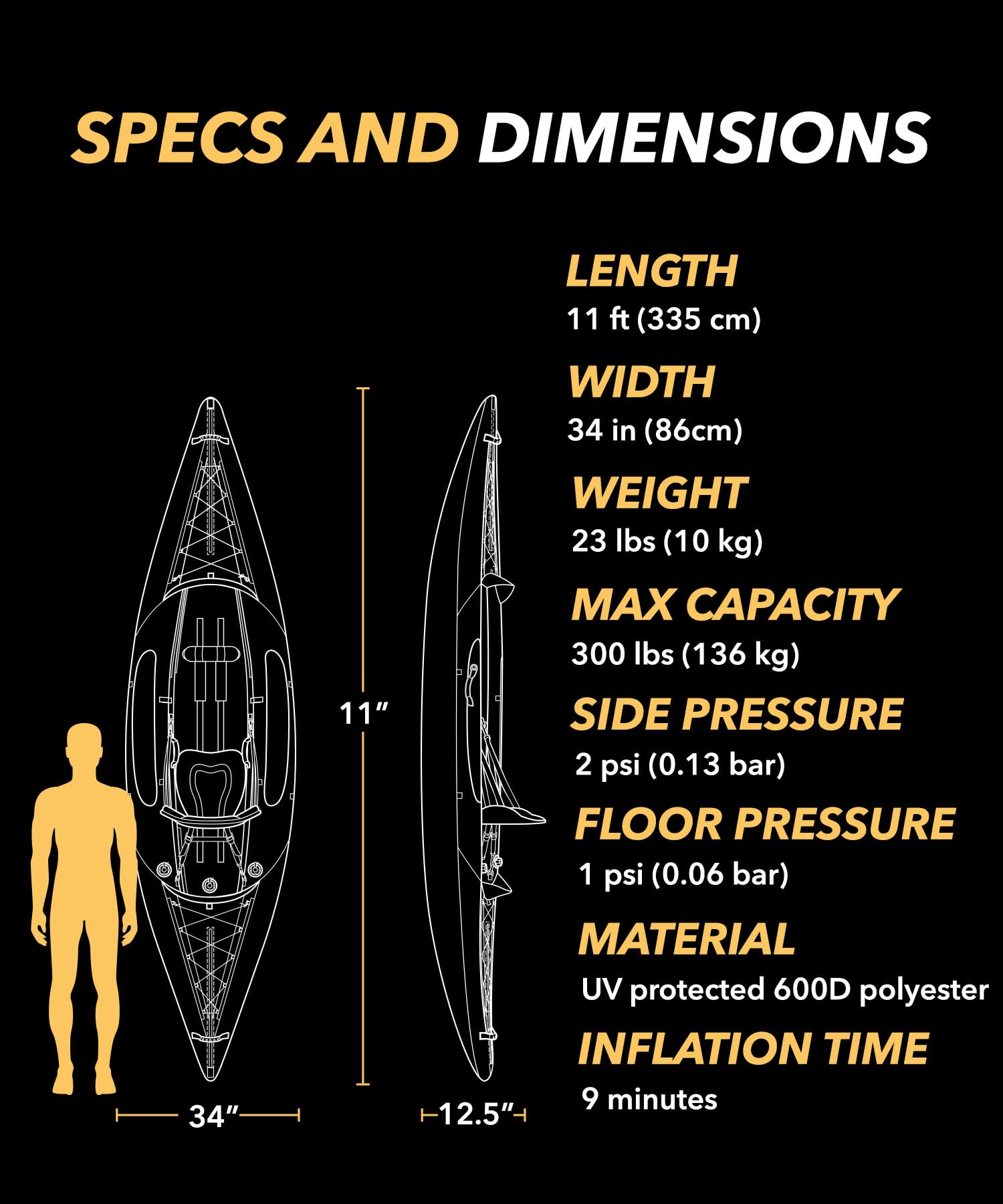 - KAYAK SPECIFICATIONS – Exterior: 11’(L) x 34”(W) / Weight: 23 Lbs. / Capacity: 300 Lbs. 1 Adult, Gear, or a Furry Friend / Inflation Time: 9 Mins. / Inflation Pressure: 2 PSI Side Tubes & 1 PSI Floor