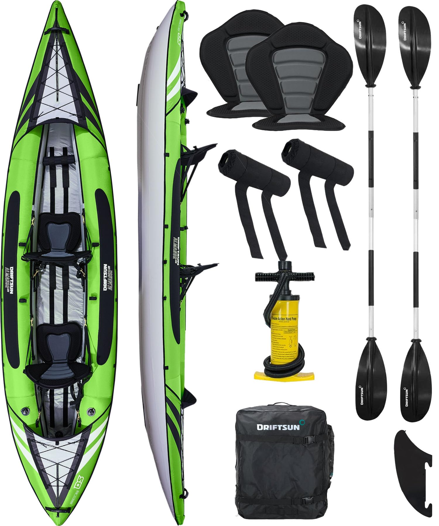 - PACKAGE INCLUDES – (1) Adjustable EVA Padded Seat with High Back Support, (1) Dual Blade Kayak Paddle, (1) Deluxe Dual Action Pump, (1) Quick-release fin, (1) Foot Rest, and (1) Travel Bag