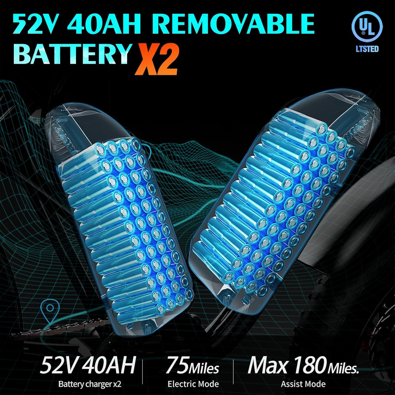 Battery | 48 V 15.6 Ah (720 Wh) Li-ion, removable & lockable, UL 2849 |