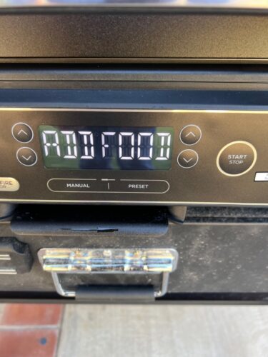 It’s easy to use, simply plug it in, fill the pellet hopper, choose the mode temperature and cook time, then press ignite. Wait for it to preheat and display “add food”, then start cooking.