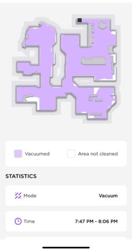 The bot cleaned for about 30mins, returned to base and emptied, resumed cleaning for another ~50mins, returned to base to empty and charge, resumed cleaning for another 50mins and returned to base to empty and recharge, declaring the job complete. I checked the app and although it says the map is not complete, it has covered 100% of the area I expect it to cover.