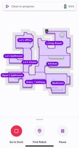 Because our house is neither toddler nor robot ready, we did not have all our rooms ready, and so we began mapping with the bedrooms and bathrooms doors closed. This turned out to be a blessing in disguise, the mapping is not great, but it does move forward, slowly. Bruce stared being more efficient in our great rooms’ right about the time we added the bedrooms and bathrooms. Our house, 3 bedroom, 2 bath, 2 great rooms and a heart kitchen, Bruce can do it on one charge now, I think because we basically added one room a day after his initial runs.